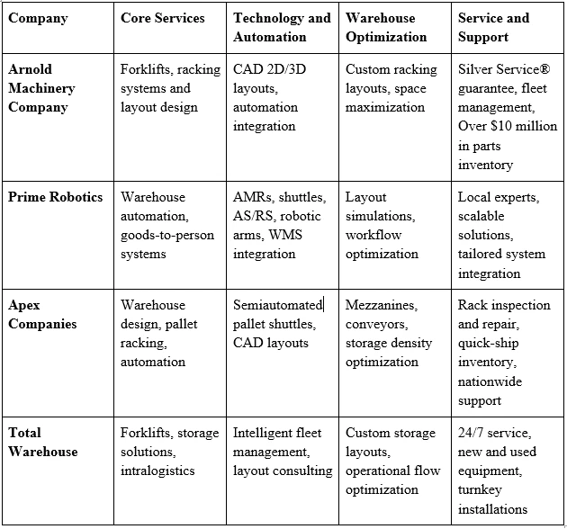 For businesses seeking efficient warehouse operations, understanding the offerings of leading providers in Utah can help guide selection. The table below highlights key capabilities, service focus and technology strengths of Arnold Machinery Company, Prime Robotics, Apex Companies and Total Warehouse.